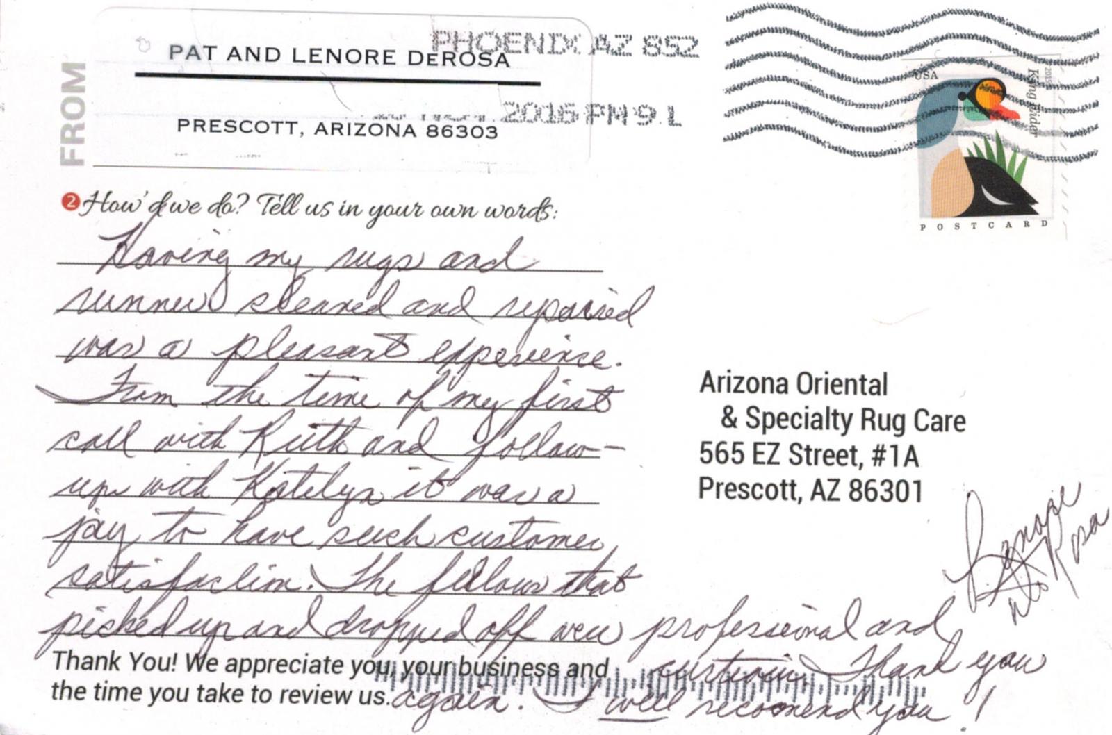 Today’s mail brought yet another BIG SMILE to my face. YES!!! ANOTHER HAPPY CLIENT!!! Happy clients are definitely my favorite thing! A job well done brings great joy and here at Arizona Oriental & Specialty Rug Care in Prescott AZ, we strive for this with every single one of our clients and their rugs.